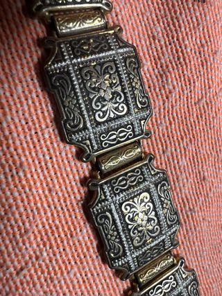 Elegante pulsera antigua con un diseño intrincado y detalles que evocan un estilo vintage. - Elaborada con metales en tonos dorados y plateados. - Presenta un patrón central con motivos florales y ornamentales. - Cada eslabón está finamente trabajado con texturas y relieves.