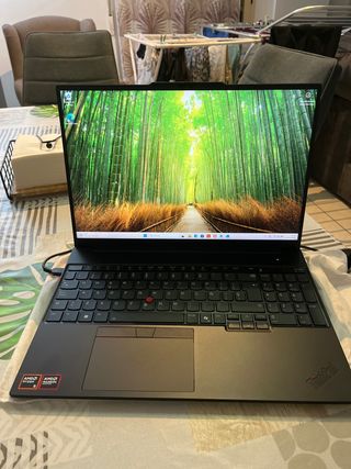 Portátil Lenovo en color negro. Diseñado para un rendimiento fiable. - Pantalla de alta definición. - Teclado completo con trackpad. - Incluye procesador AMD Ryzen y gráficos Radeon.