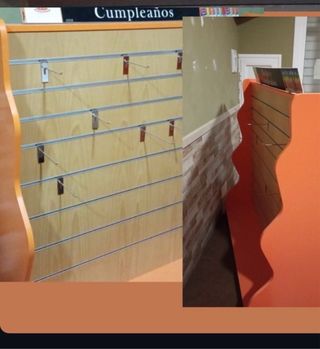 Mueble expositor de madera con un diseño escalonado y práctico. - Estructura de madera. - Color naranja vibrante. - Diseño escalonado con varios niveles. - Base con compartimentos para almacenamiento.