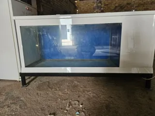 Acuario listo para instalar con todo lo necesario. - Mueble blanco. - Decoración interior con rocas y plantas.