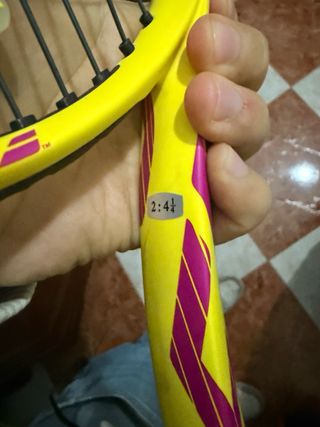 Raqueta de tenis Babolat, modelo inspirado en Rafael Nadal. - Diseño llamativo en amarillo, naranja, rojo y rosa. - Cuerdas negras. - Empuñadura naranja.