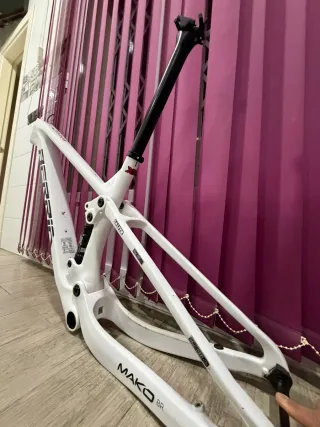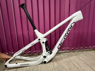 Cuadro de bicicleta de doble suspensión Berría Mako BR,el tope de gama de la marca,en color blanco,con rodamientos y suspensión revisados. Suspensión de 100 mm de recorrido rock shox sid luxe. Se encuentra en perfecto estado,con marcas en la pintura,normales por el uso en mtb. Propio para montar una buena bicicleta a la carta.