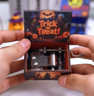 Cajita de música con temática de Halloween. - Diseño con brujas, fantasmas y calabazas. - Mecanismo de manivela para reproducir música.