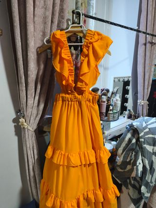 Vestido de verano con un vibrante color naranja y detalles de volantes. - Diseño con escote en V. - Mangas acampanadas. - Cintura elástica. - Falda con volantes en capas.