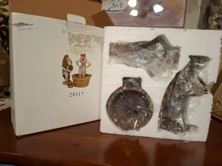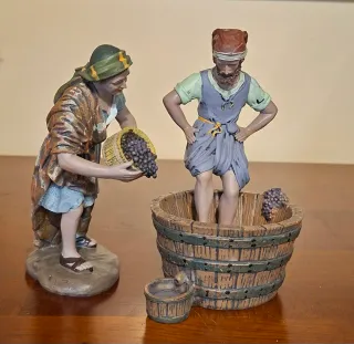 Conjunto de figuras para Belén que representan la vendimia. Incluye dos figuras y un barril. - Una figura vierte uvas en una cesta. - Otra figura está pisando uvas en un barril. - Incluye un pequeño cubo. - Detallado diseño artesanal.