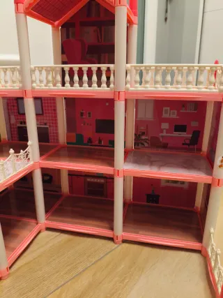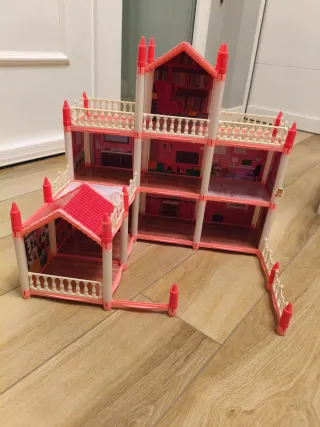Casa de muñecas de cartón y plástico. Es práctica para jugar ya que tiene todas las estancias abiertas.