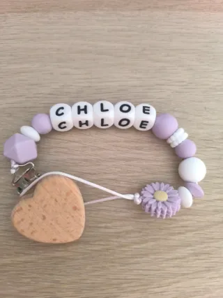 Chupetero personalizado con el nombre - Cuentas blancas con letras negras. - Cuentas de colores variados. - Cuentas con diseño de balón de fútbol. - Cuentas transparentes con confeti. - Cuentas con forma de nube y disco. - Incluye clip para sujetar el chupete y bola negra. Sin nombre 5,50 Con nombre 6,50