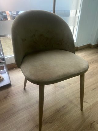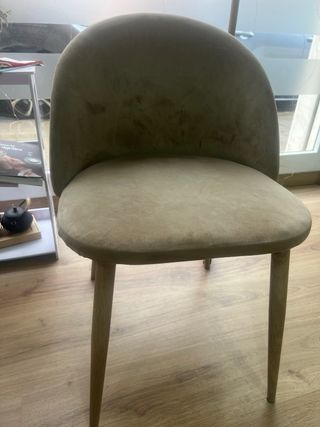 Elegante silla tapizada en terciopelo con patas de madera. - Diseño moderno y confortable. - Acabado suave al tacto. Precio de ambas Utilizadas: Una perfecta. La otra silla la regalo hau que arreglarla Las medidas no son reales,no hago envío de este producto