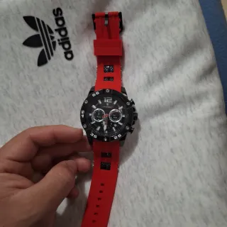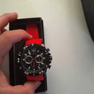 Reloj con correa de silicona roja y esfera negra. - Bisel negro con detalles plateados. - Correa de silicona roja. - Esfera negra con detalles en rojo y blanco. - Tres subesferas en la esfera.