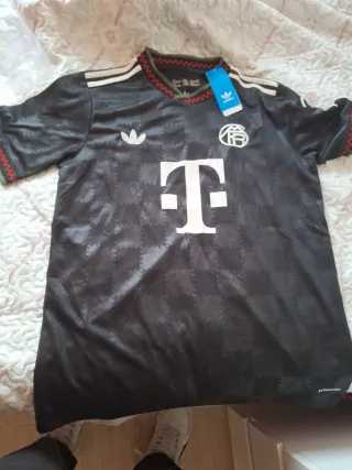 Camiseta deportiva del Bayer con diseño moderno. - Color negro con detalles en rojo y blanco. - Logo de Adidas y escudo del equipo. - Tejido con patrón cuadriculado.