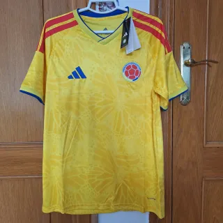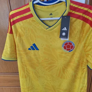 Camiseta de fútbol de Colombia con diseño llamativo. - Color amarillo vibrante. - Detalles en rojo y azul. - Logo de Adidas. - Escudo de la Federación Colombiana de Fútbol.