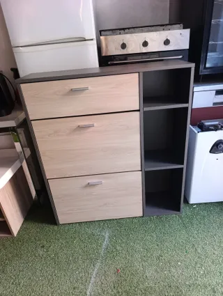 Mueble zapatero con un diseño moderno y funcional. - Medidas: 90 cm de ancho, 102 cm de alto y 27 cm de profundidad. - Combinación de acabados en madera y gris. - Estructura robusta.