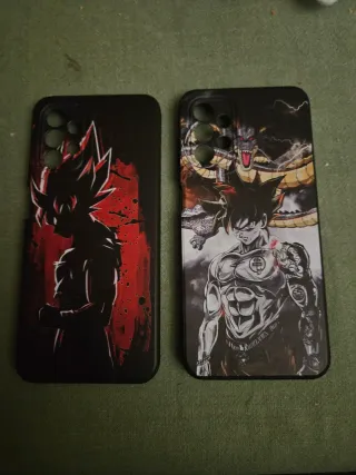 Dos fundas para móvil Samsung A15 con diseños de Dragon Ball. - Diseño 1: Silueta de Goku en Super Saiyan con fondo rojo y salpicaduras. - Diseño 2: Goku musculoso con Shenron al fondo.