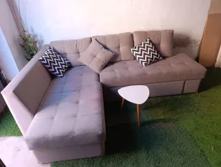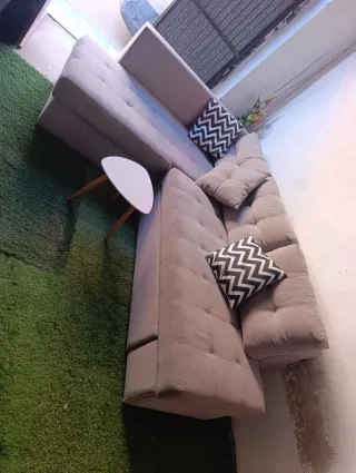 Sofá chaise longue convertible en cama, ideal para aprovechar el espacio. - Medidas: 180 cm de ancho x 260 cm de largo. - Tapicería de tela. - Diseño moderno en tonos beige y negro.