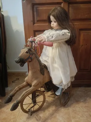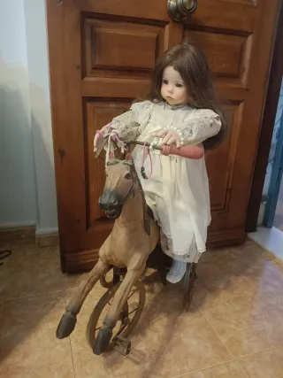 Preciosa muñeca de porcelana sentada en un caballo. - Muñeca de porcelana con vestido. - Caballo. - Ideal para coleccionistas o decoración.