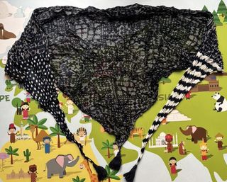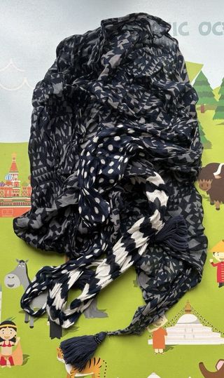 Pañuelo / fular infantil con un diseño original y divertido. Estampado geométrico y de lunares. Detalle de flecos y borlas. Tejido muy ligero. Talla única. Zona de recogida: Estación de Renfe de Pinto. Posibilidad de envío por Wallapop.
