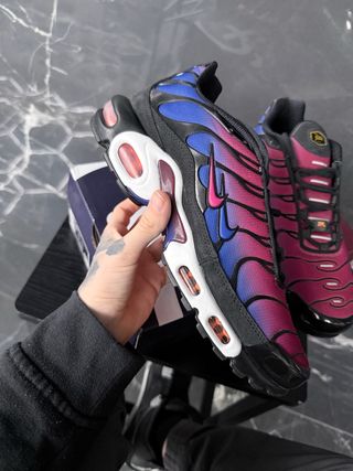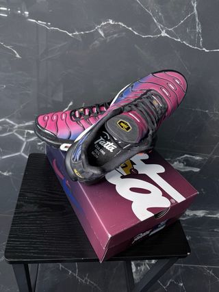 Zapatillas deportivas Nike Air Max con un diseño único. - Combinación de colores azul y rosa vibrante. - Detalles de la colaboración con Barça y Patta.