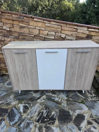 Armario de diseño moderno con una combinación de colores neutros. - Acabado en madera y blanco. - Tiradores metálicos. - Patas finas para un estilo ligero. 140×40 h - 80
