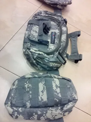 Riñonera con estampado de camuflaje digital pixelado. Tres piezas. - Diseño con múltiples compartimentos. - Correa ajustable para la cintura. - Cierre de hebilla.