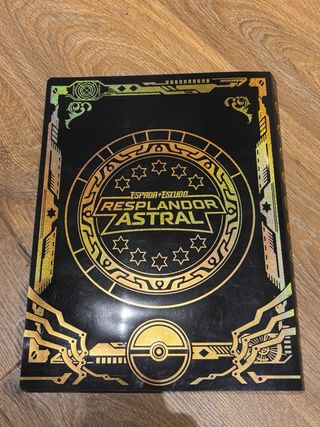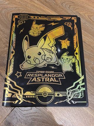 Álbum para cartas Pokémon de la colección Resplandor Astral. - Diseño negro con detalles dorados holográficos. - Ilustraciones de Pikachu y el logo de Pokémon. - Incluye el título Espada y Escudo Resplandor Astral.