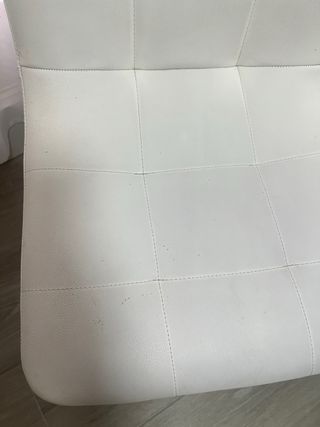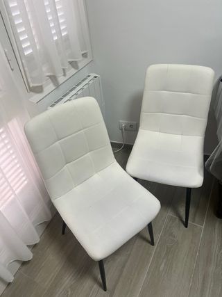 Modernas sillas para el comedor o cualquier estancia. Su diseño elegante y acabado las hacen muy versátiles. - Juego de 4 sillas. - Tapicería de polipiel. - Patas metálicas negras. Las sillas funcionan a la perfeccion, pero estan manchadas y un poco peladas del forro de abajo. Con una funda de sillas quedan perfectas. A 30€ las 4 sillas (en su momento me costaron 35€ cada silla)