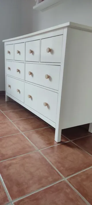 Cómoda de la serie Hemnes de Ikea en color blanco. Cuenta con varios cajones para almacenamiento. - Diseño clásico y elegante. - Tiradores redondos de madera. - Perchero de pared a conjunto.