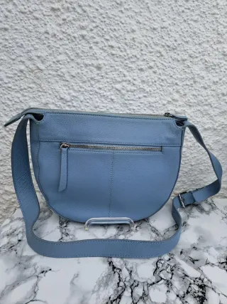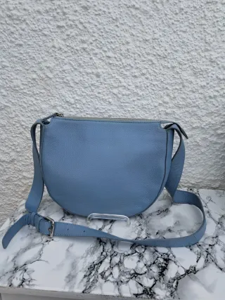 Bandolera de cuero y cuero sintético en un bonito tono azul claro. Su diseño es moderno y práctico para el día a día. - Material: cuero sintético. - Color: azul claro. - Tipo: bandolera ajustable. Un compartimento en la parte atrás con cremallera y dos compartimentos al interior, donde uno tiene también cremallera. Dimensiones: largo 27 cm - altura 22 cm - profundidad 10 cm