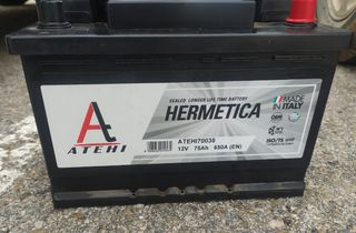 Batería de coche marca ATEHI, modelo Hermetica. - Capacidad: 75Ah - Corriente de arranque en frío (EN): 650A - Voltaje: 12V - Fabricada en Italia - Certificación ISO/TS 16949