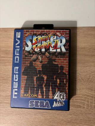 Juego Super Street Fighter II para Sega Megadrive. - Caja con diseño de ladrillos y siluetas de personajes. - Logo de Capcom y 40 Meg visible. - Banda azul con logo de SEGA MEG.