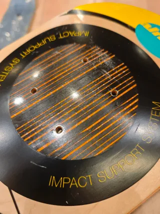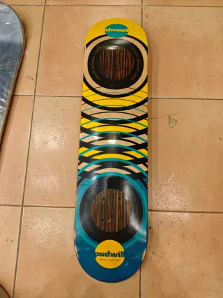 Tabla de skate de la marca Almost con refuerzos de fibra de carbono en la parte de los ejes, medida 7,6 - Logo de Almost en la parte superior. - Nombre pudwill en la parte inferior.