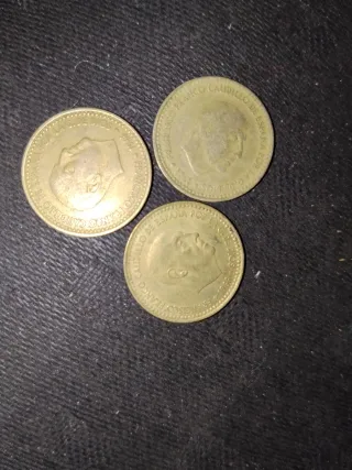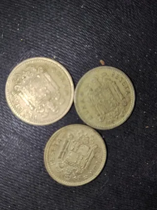 Conjunto de tres monedas de peseta española. - Diseño con escudo. - Inscripción 'Peseta' y 'Una Peseta'.