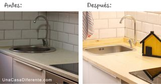 Mueble de cocina de diseño moderno y elegante. - Acabado en tonos beige y gris. - Combinación de materiales de madera y metal.