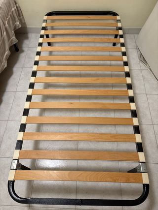 Base de cama individual con estructura resistente. - Listones de madera para soporte. - Marco de metal duradero.