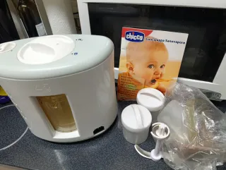 Vaporera Chicco Cuocipappa Sanovapore para preparar comida para bebés. Incluye varios accesorios. - Vaporera y licuadora todo en uno. - Recipientes de almacenamiento. - Cuchilla para triturar. - Libro de recetas incluido.