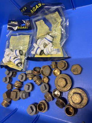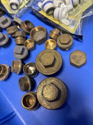 Lote de tapones de fontanería de diferentes materiales y tamaños. - Tapones metálicos y de plástico. - Variedad de roscas y formas. - Ideales para reparaciones o proyectos.