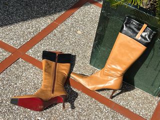 Elegantes botas de caña alta con detalles en contraste. - Material exterior de cuero. - Combinación de colores marrón y negro. - Tacón de aguja. - Cremallera lateral para facilitar el acceso.