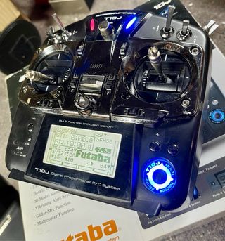 Emisora de radio control Futaba T10J. Tiene el logo de la parte izquierda inferior medio borrado, no por desgaste, tiene muy poco uso, por accidente cayó una gota de metanol y al limpiarlo se borró. - Transmisión Diversity. - Pantalla LCD retroiluminada.