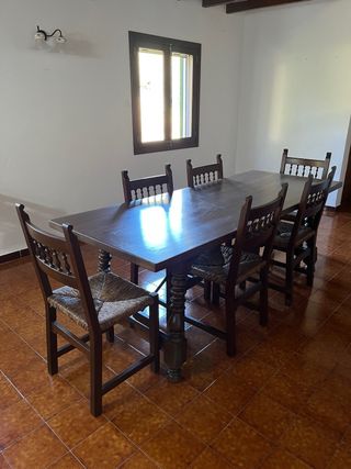 Conjunto de muebles de estilo castellano, ideal para dar un toque rústico a tu hogar. Se pueden comprar todos juntos o separados. Incluyen: - Mesa de madera maciza (75 x 205 x 81 cm.) - Seis sillas con asiento de esparto. - 2 x aparador bajo con cajones y armarios (45 x 190 x 81 cm.) UNO de ellos tiene carcoma. - 1 aparador alto con armarios (junto con el aparador bajo suma 190 cm. de altura). Estan todas las piezas como nuevas, excepto uno de los aparadores que tiene carcoma, pero se puede reparar. Se pueden apreciar algunas rayaduras sin importancia en las superficies horizontales (ver fotos). PRECIO NEGOCIABLE!