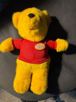 Adorable peluche de osito amarillo con camiseta roja. - Diseño clásico. - Detalle del nombre Nelson en la camiseta.
