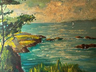 Pintura al óleo de un paisaje marino con acantilados y árboles. - Técnica de pintura al óleo. - Representación de costa rocosa. - Detalle de vegetación y mar. - Firma del artista visible.