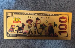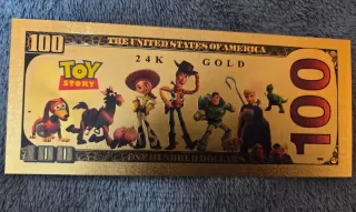 Billete conmemorativo de 100 dólares con diseño de Toy Story. - Representación de Woody. - Acabado en color dorado. - Inscripción Toy Story en el centro. - Réplica de billete de 100 dólares.