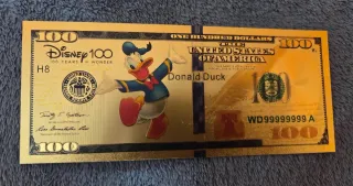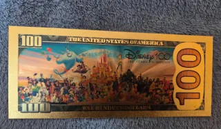 Billete conmemorativo de la celebración Disney 100 Years of Wonder. Presenta un diseño inspirado en Mickey Mouse y el número 100. - Diseño con Mickey Mouse. - Conmemorativo Disney 100 Years of Wonder. - Número de serie WD99999999 A.