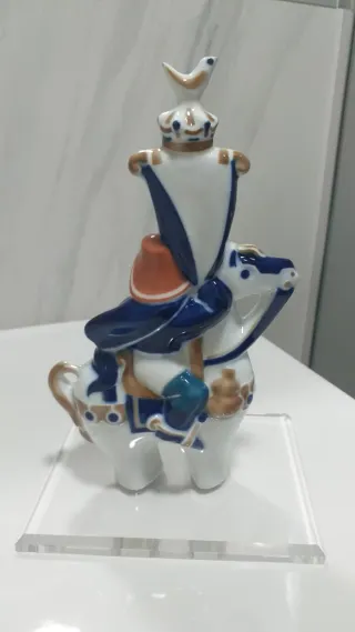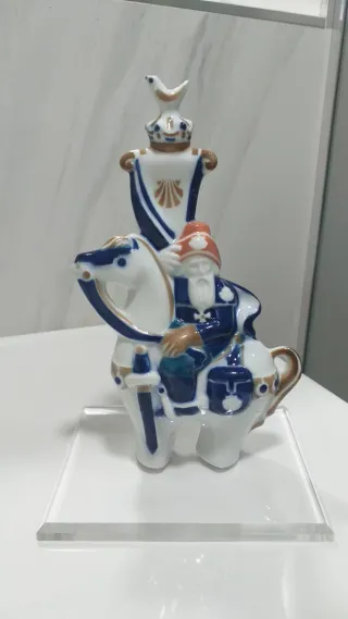 Figura de porcelana de Sargadelos. Número 5 . Base de metacrilato. - Representa a un peregrino Duque de Aquitania. - Diseño con detalles en azul y dorado. - Montado sobre un caballo.