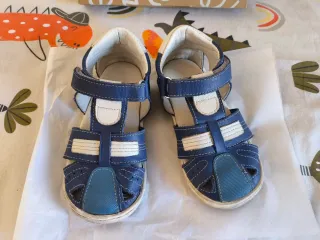 Sandalias infantiles de la marca Fluffy, estilo barefoot. Son cómodas y flexibles. - Color azul con detalles en blanco. - Cierre de velcro. - Suela fina y flexible.