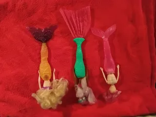 Conjunto de tres muñecas sirena con colas de colores. - Una muñeca con pelo rosa y cola rosa. - Una muñeca con pelo verde y cola verde. - Una muñeca con pelo rubio y cola naranja y morada.
