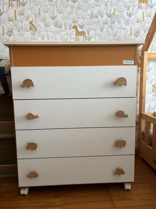 Cómoda infantil de la marca Micuna con un diseño divertido y original. - Tiradores de madera con formas de animales. - Acabado superior en color madera - Estructura blanca.