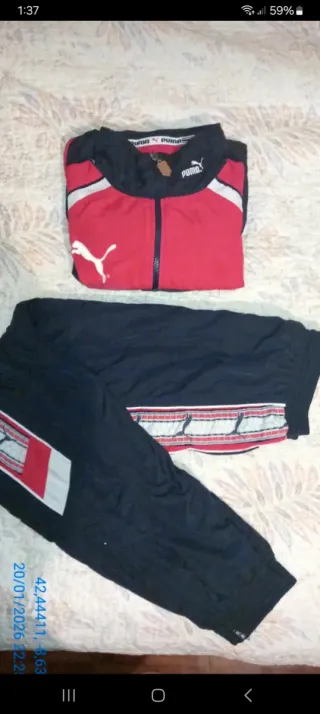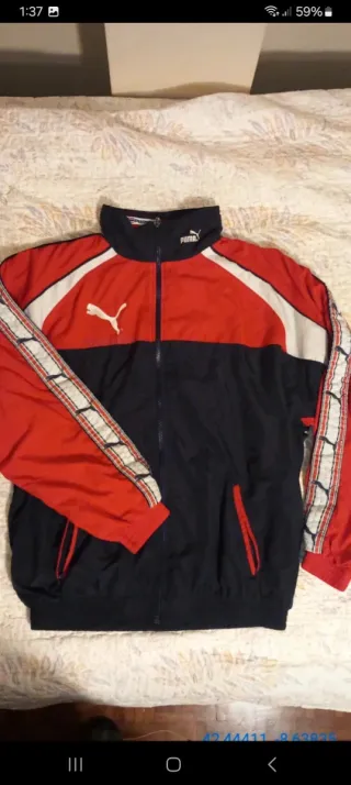 Conjunto deportivo completo de jugador Federacion Gallega de futbol de la marca Puma, con un diseño vintage de los años 90. - Tenia un parche de la FGF cosido que se desprendió(va incluido por si lo quieres volver a coser) - Debajo del distintivo Puma puedes colocar una tira con tu nombre. - Chaqueta con cremallera frontal. - Pantalón a juego. - Detalles de color rojo,blanco y azul marino en la chaqueta y el pantalón.