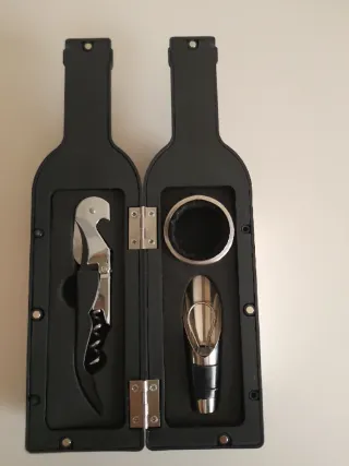 Set de utensilios para sumillería de la marca Gran Reserva. Botella negra con etiqueta roja. Se cierra con imanes. Su altura es de 24 cm. - vertedor de vino con tapón - sacacorchos --Aro antigoteo
