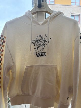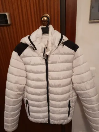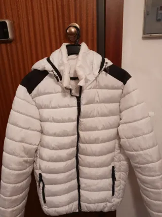 Cazadora acolchada de color blanco con detalles en negro. Talla XL. Muy caliente, con un bolsillo ocunto en el interior del pecho. - Diseño unisex. - Capucha. - Cremallera frontal. - Bolsillos laterales con cremallera.