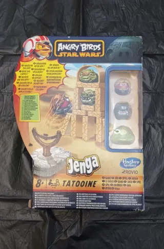 Juego de mesa Jenga de Angry Birds Star Wars. - Temática de Tatooine. - Incluye figuras de personajes. - Para 1-2 jugadores. - Requiere montaje para su uso. Está nuevo salvo por la perdida de dibujo en la parte trasera de la caja. Muy, muy poco uso